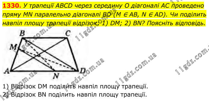 1330. У трапеції ABCD через середину O діагоналі AC проведено пряму MN паралельно діагоналі BD (M ∈ AB, N ∈ AD). Чи поділить навпіл площу трапеції відрізок: 1) DM; 2) BN? Поясніть відповідь. 1) Відрізок DM поділить навпіл площу трапеції. 2) Відрізок BN поділить навпіл площу трапеції.