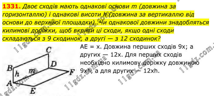 1331. Двоє сходів мають однакові основи m (довжина за горизонталлю) і однакові висоти h (довжина за вертикаллю від основи до верхньої площадки). Чи однакової довжини знадобляться килимові доріжки, щоб вкрити ці сходи, якщо одні сходи складаються з 9 сходинок, а другі — з 12 сходинок? АЕ = x. Довжина перших сходів 9x; а других — 12x. Для перших сходів необхідно килимову доріжку довжиною 9xh, а для других — 12хh.