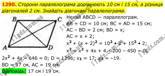 1290. Сторони паралелограма дорівнюють 10 см і 15 см, а різниця діагоналей 2 см. Знайдіть діагоналі паралелограма. Нехай ABCD — паралелограм. AB = CD = 10 cм; BC = AD = 15 см; AC – BD = 2 cм; BD = x; AC = x + 2; x2 + (x + 2)2 = 102 • 2 + 152 • 2; x2 + x2 + 4x + 4 – 200 – 450 = 0; 2x2 + 4x – 646 = 0; D = 1296; x1 = 17; x2 = –19. BD = 17 cм, AC = 19 cм. Відповідь: 17 cм і 19 cм.