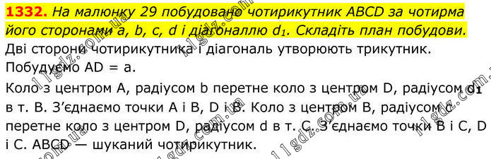 1332. На малюнку 29 побудовано чотирикутник ABCD за чотирма його сторонами a, b, с, d і діагоналлю d1. Складіть план побудови. Дві сторони чотирикутника і діагональ утворюють трикутник. Побудуємо AD = а. Коло з центром А, радіусом b перетне коло з центром D, радіусом d1 в т. В. З’єднаємо точки A і В, D i В. Коло з центром В, радіусом с перетне коло з центром D, радіусом d в т. С. З’єднаємо точки B i C, D i C. ABCD — шуканий чотирикутник.