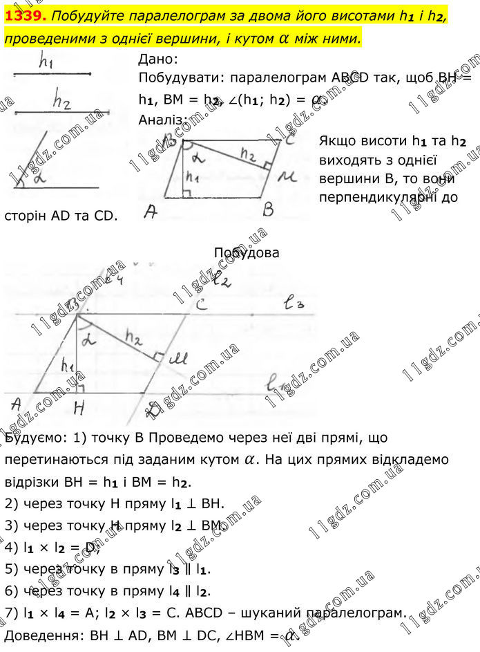 1339. Побудуйте паралелограм за двома його висотами h1 і h2, проведеними з однієї вершини, і кутом α між ними. Дано: Побудувати: паралелограм ABCD так, щоб BH = h1, BM = h2, ∠(h1; h2) = α. Аналіз: Якщо висоти h1 та h2 виходять з однієї вершини В, то вони перпендикулярні до сторін AD та CD. Побудова Будуємо: 1) точку В Проведемо через неї дві прямі, що перетинаються під заданим кутом α. На цих прямих відкладемо відрізки BH = h1 і BM = h2. 2) через точку Н пряму l1 ⊥ BH. 3) через точку Н пряму l2 ⊥ BM. 4) l1 × l2 = D; 5) через точку в пряму l3 ∥ l1. 6) через точку в пряму l4 ∥ l2. 7) l1 × l4 = А; l2 × l3 = С. ABCD – шуканий паралелограм. Доведення: BH ⊥ AD, BM ⊥ DC, ∠HBM = α.