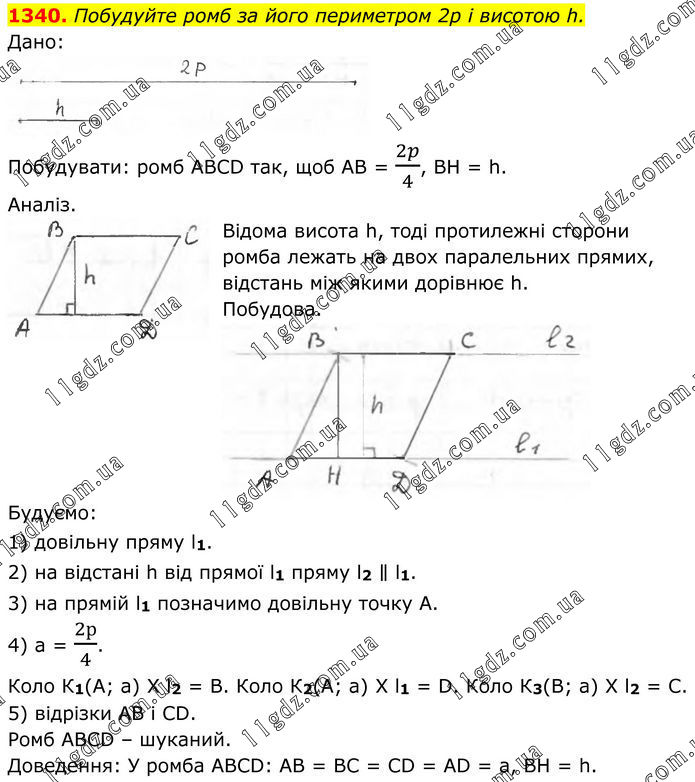 1340. Побудуйте ромб за його периметром 2p і висотою h. Дано: Побудувати: ромб ABCD так, щоб АВ = 2p/4, ВН = h. Аналіз. Відома висота h, тоді протилежні сторони ромба лежать на двох паралельних прямих, відстань між якими дорівнює h. Побудова. Будуємо: 1) довільну пряму l1. 2) на відстані h від прямої l1 пряму l2 ∥ l1. 3) на прямій l1 позначимо довільну точку А. 4) а = 2р/4. Коло К1(А; а) X l2 = B. Коло К2(А; а) X l1 = D. Коло К3(B; а) X l2 = C. 5) відрізки AB і CD. Ромб ABCD – шуканий. Доведення: У ромба ABCD: AB = BC = CD = AD = а, ВН = h.