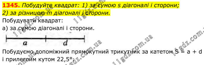1345. Побудуйте квадрат: 1) за сумою s діагоналі і сторони; 2) за різницею m діагоналі і сторони. Побудувати квадрат: а) за сумою діагоналі і сторони. Побудуємо допоміжний прямокутний трикутник за катетом S = a + d i прилеглим кутом 22,5°.