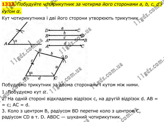 1333. Побудуйте чотирикутник за чотирма його сторонами a, b, с, d і кутом α. Кут чотирикутника і дві його сторони утворюють трикутник. Побудуємо трикутник за двома сторонами і кутом між ними. 1. Побудуємо кут α. 2. На одній стороні відкладемо відрізок c, на другій відрізок d. AB = = с; AC = d. 3. Коло з центром В, радіусом BD перетне коло з центром С, радіусом CD в т. D. ABDC — шуканий чотирикутник.