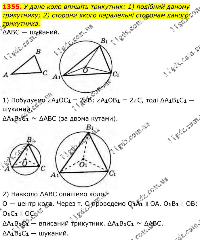 1355. У дане коло впишіть трикутник: 1) подібний даному трикутнику; 2) сторони якого паралельні сторонам даного трикутника. ∆АВС — шуканий. 1) Пoбyдyємo ∠A1OC1 = 2∠B; ∠A1OB1 = 2∠C, тоді ∆А1В1С1 — шуканий. ∆А1В1С1 ~ ∆АВС (за двома кутами). 2) Навколо ∆АВС опишемо коло. О — центр кола. Через т. О проведемо О1А1 ∥ ОА. О1В1 ∥ OB; О1С1 ∥ ОС. ∆A1B1C1 — вписаний трикутник. ∆А1В1С1 ~ ∆АВС. ∆A1B1C1 — шуканий.