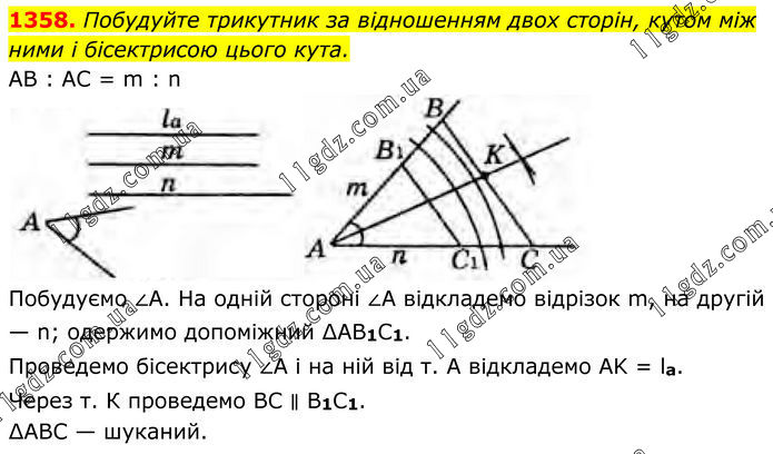 1358. Побудуйте трикутник за відношенням двох сторін, кутом між ними і бісектрисою цього кута. АВ : АС = m : n Побудуємо ∠A. На одній стороні ∠А відкладемо відрізок m, на другій — n; одержимо допоміжний ∆AB1C1. Проведемо бісектрису ∠A і на ній від т. А відкладемо AK = la. Через т. К проведемо ВС ∥ B1C1. ∆АВС — шуканий.