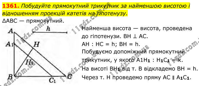 1361. Побудуйте прямокутний трикутник за найменшою висотою і відношенням проекцій катетів на гіпотенузу. ∆АВС — прямокутний. Найменша висота — висота, проведена до гіпотенузи. ВН ⊥ АС. АH : HС = h; BH = h. Побудуємо допоміжний прямокутний трикутник, у якого А1H1 : H1С1 = k. На висоті ВH1 від т. В відкладемо BH = h. Через т. H проведемо пряму АС ∥ А1С1.