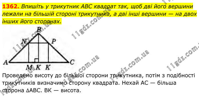 1362. Впишіть у трикутник ABC квадрат так, щоб дві його вершини лежали на більшій стороні трикутника, а дві інші вершини — на двох інших його сторонах. Проведемо висоту до більшої сторони трикутника, потім з подібності трикутників визначимо сторону квадрата. Нехай АС — більша сторона ∆АВС. ВК — висота.