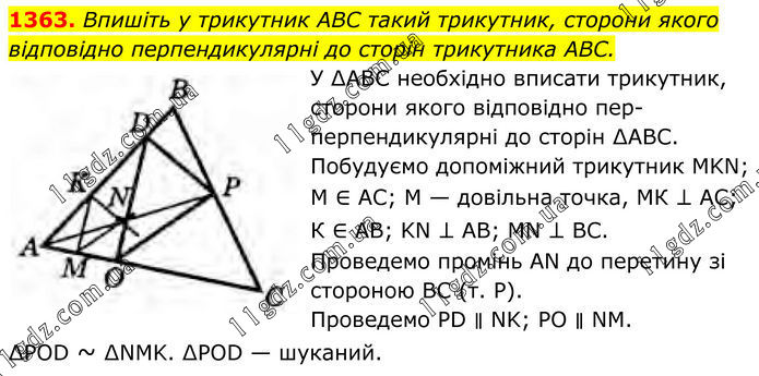 1363. Впишіть у трикутник ABC такий трикутник, сторони якого відповідно перпендикулярні до сторін трикутника ABC. У ∆АВС необхідно вписати трикутник, сторони якого відповідно пер перпендикулярні до сторін ∆АВС. Побудуємо допоміжний трикутник MKN; М ∈ АС; М — довільна точка, МК ⊥ АС; К ∈ AB; KN ⊥ АВ; MN ⊥ ВС. Проведемо промінь AN до перетину зі стороною ВС (т. Р). Проведемо PD ∥ NK; РО ∥ NM. ∆POD ~ ∆NMK. ∆POD — шуканий.