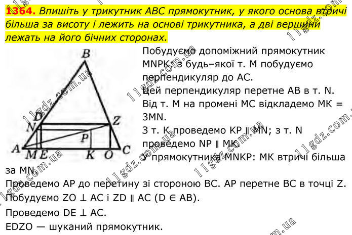 1364. Впишіть у трикутник ABC прямокутник, у якого основа втричі більша за висоту і лежить на основі трикутника, а дві вершини лежать на його бічних сторонах. Побудуємо допоміжний прямокутник MNPK: з будь–якої т. М побудуємо перпендикуляр до АС. Цей перпендикуляр перетне AB в т. N. Від т. М на промені MC відкладемо МК = 3MN. З т. К проведемо KP ∥ MN; з т. N проведемо NP ∥ МК. У прямокутника MNKP: МК втричі більша за MN. Проведемо АР до перетину зі стороною ВС. АР перетне ВС в точці Z. Побудуємо ZO ⊥ AC i ZD ∥ AC (D ∈ AВ). Проведемо DE ⊥ AC. EDZO — шуканий прямокутник.