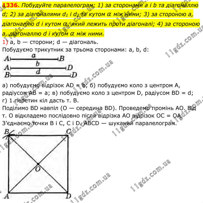 1336. Побудуйте паралелограм: 1) за сторонами a і b та діагоналлю d; 2) за діагоналями d1 і d2 та кутом α між ними; 3) за стороною а, діагоналлю d і кутом α, який лежить проти діагоналі; 4) за стороною а, діагоналлю d і кутом α між ними. 1) а, b — сторони; d — діагональ. Побудуємо трикутник за трьома сторонами: а, b, d: а) побудуємо відрізок AD = b; б) побудуємо коло з центром А, радіусом AB = а; в) побудуємо коло з центром D, радіусом BD = d; г) 1 перетин кіл дасть т. В. Поділимо BD навпіл (О — середина BD). Проведемо промінь АО. Від т. О відкладемо послідовно після відрізка АО відрізок ОС = ОА. З’єднаємо точки В і С, С і D. ABCD — шуканий паралелограм.