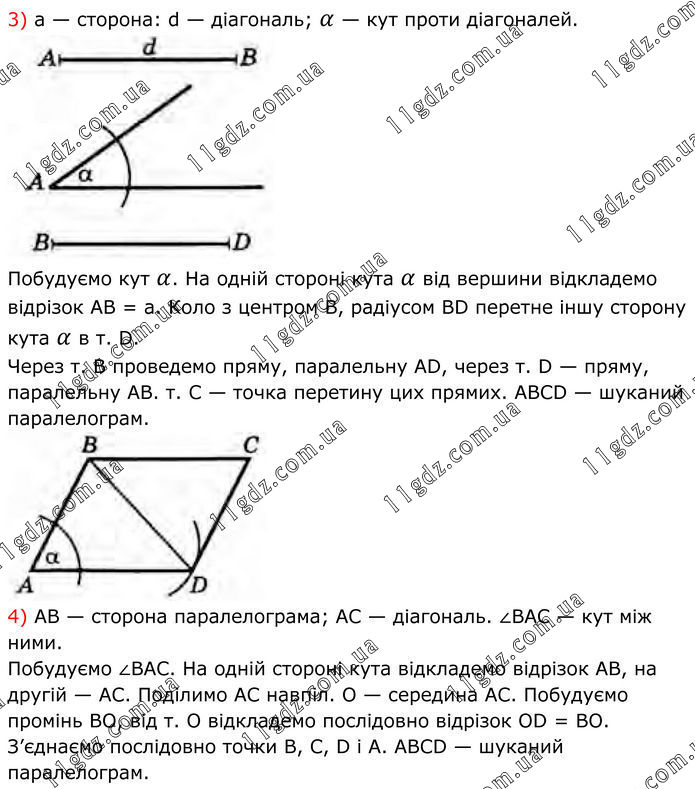 3) а — сторона: d — діагональ; α — кут проти діагоналей. Побудуємо кут α. На одній стороні кута α від вершини відкладемо відрізок АВ = а. Коло з центром В, радіусом BD перетне іншу сторону кута α в т. D. Через т. В проведемо пряму, паралельну AD, через т. D — пряму, паралельну АВ. т. С — точка перетину цих прямих. ABCD — шуканий паралелограм. 4) АВ — сторона паралелограма; АС — діагональ. ∠BAC — кут між ними. Побудуємо ∠BAC. На одній стороні кута відкладемо відрізок АВ, на другій — АС. Поділимо АС навпіл. О — середина АС. Побудуємо промінь ВО, від т. О відкладемо послідовно відрізок OD = ВО. З’єднаємо послідовно точки В, С, D i А. ABCD — шуканий паралелограм.