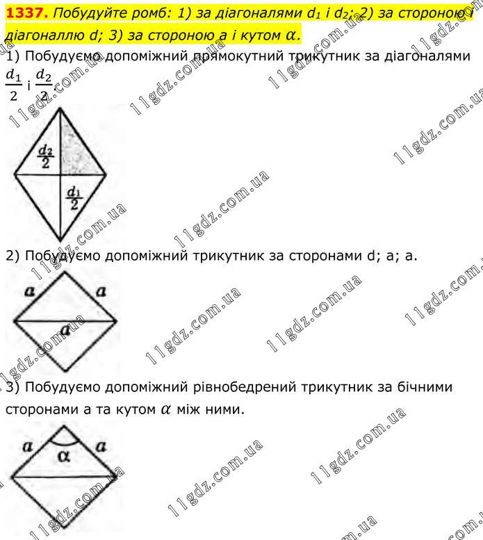 1337. Побудуйте ромб: 1) за діагоналями d1 і d2; 2) за стороною і діагоналлю d; 3) за стороною а і кутом α. 1) Побудуємо допоміжний прямокутний трикутник за діагоналями d_1/2 і d_2/2. 2) Побудуємо допоміжний трикутник за сторонами d; а; а. 3) Побудуємо допоміжний рівнобедрений трикутник за бічними сторонами а та кутом α між ними.