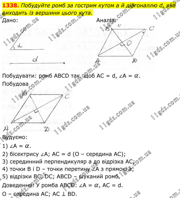 1338. Побудуйте ромб за гострим кутом а й діагоналлю d, яка виходить із вершини цього кута. Дано: Аналіз: Побудувати: ромб ABCD так, щоб AC = d, ∠A = α. Побудова Будуємо: 1) ∠A = α. 2) бісектрису ∠A; AC = d (O – середина АС); 3) серединний перпендикуляр а до відрізка АС; 4) точки В і D – точки перетину ∠А з прямою а; 5) відрізки BC, DC; ABCD – шуканий ромб. Доведення: У ромба ABCD: ∠A = α, AC = d. O – середина АС; AC ⊥ BD.