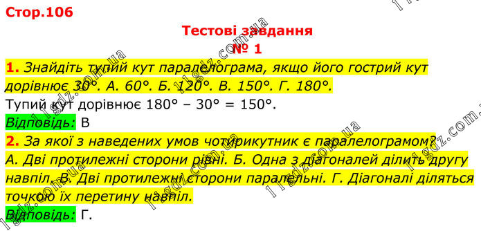 Тестові завдання № 1 1. Знайдіть тупий кут паралелограма, якщо його гострий кут дорівнює 30°. А. 60°. Б. 120°. В. 150°. Г. 180°. Тупий кут дорівнює 180° – 30° = 150°. Відповідь: В 2. За якої з наведених умов чотирикутник є паралелограмом? A. Дві протилежні сторони рівні. Б. Одна з діагоналей ділить другу навпіл. B. Дві протилежні сторони паралельні. Г. Діагоналі діляться точкою їх перетину навпіл. Відповідь: Г.