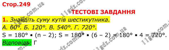 ТЕСТОВІ ЗАВДАННЯ 1. Знайдіть суму кутів шестикутника. А. 60°. Б. 120°. В. 540°. Г. 720°. S = 180° • (n – 2); S = 180° • (6 – 2) = 180° • 4 = 720°. Відповідь: Г.