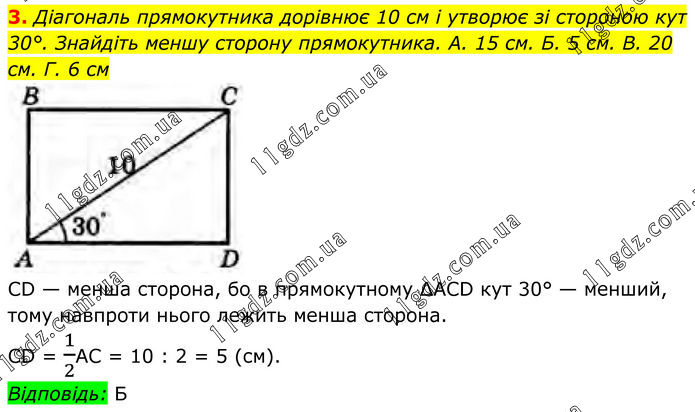 3. Діагональ прямокутника дорівнює 10 см і утворює зі стороною кут 30°. Знайдіть меншу сторону прямокутника. А. 15 см. Б. 5 см. В. 20 см. Г. 6 см CD — менша сторона, бо в прямокутному ∆ACD кут 30° — менший, тому навпроти нього лежить менша сторона. СD = 1/2AС = 10 : 2 = 5 (см). Відповідь: Б