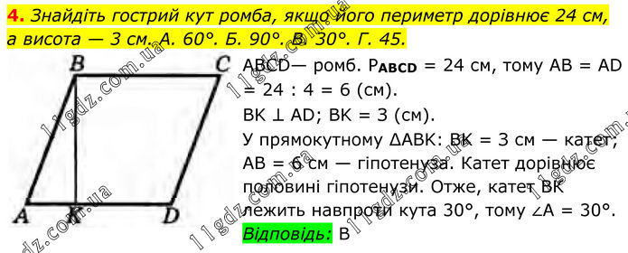 4. Знайдіть гострий кут ромба, якщо його периметр дорівнює 24 см, а висота — 3 см. А. 60°. Б. 90°. В. 30°. Г. 45. ABCD— ромб. PABCD = 24 см, тому AB = AD = 24 : 4 = 6 (см). BK ⊥ AD; BK = З (см). У прямокутному ∆ABK: BK = З см — катет; AB = 6 см — гіпотенуза. Катет дорівнює половині гіпотенузи. Отже, катет ВК лежить навпроти кута 30°, тому ∠A = 30°. Відповідь: В.