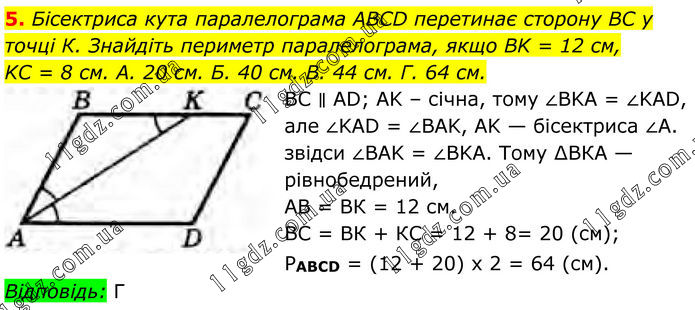 5. Бісектриса кута паралелограма ABCD перетинає сторону BC у точці К. Знайдіть периметр паралелограма, якщо BK = 12 см, KC = 8 см. А. 20 см. Б. 40 см. В. 44 см. Г. 64 см. BC ∥ AD; AK – січна, томy ∠BKA = ∠KAD, але ∠KAD = ∠BAK, AK — бісектриса ∠A. звідси ∠BAK = ∠BKA. Тому ∆ВКА — рівнобедрений, AB = ВК = 12 см. ВС = ВК + КС = 12 + 8= 20 (см); РABCD = (12 + 20) x 2 = 64 (см). Відповідь: Г.