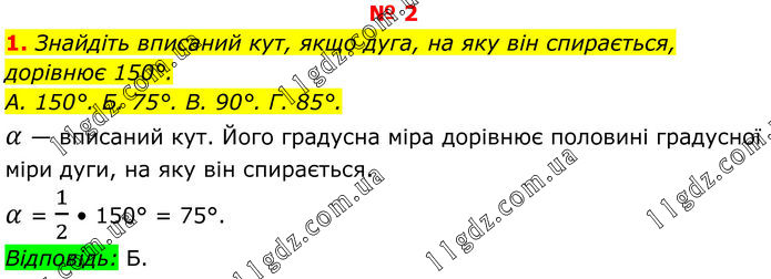№ 2 1. Знайдіть вписаний кут, якщо дуга, на яку він спирається, дорівнює 150°. А. 150°. Б. 75°. В. 90°. Г. 85°. α — вписаний кут. Його градусна міра дорівнює половині градусної міри дуги, на яку він спирається. α = 1/2 • 150° = 75°. Відповідь: Б.