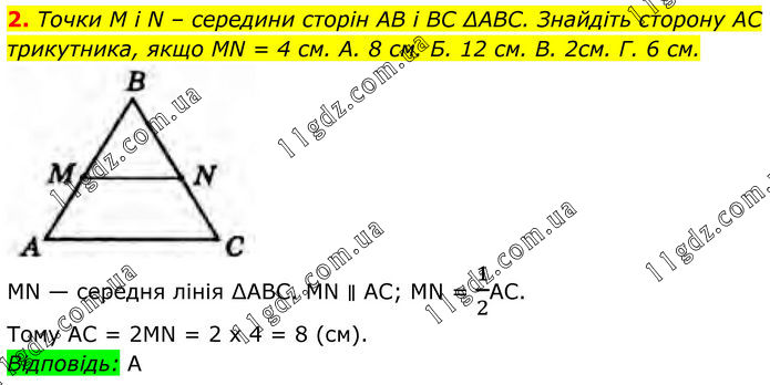 2. Точки М i N – середини сторін AB і ВС ∆АВС. Знайдіть сторону АС трикутника, якщо MN = 4 см. А. 8 см. Б. 12 см. В. 2см. Г. 6 см. MN — середня лінія ∆АВС. MN ∥ АС; MN = 1/2AC. Тому АС = 2MN = 2 x 4 = 8 (см). Відповідь: А.