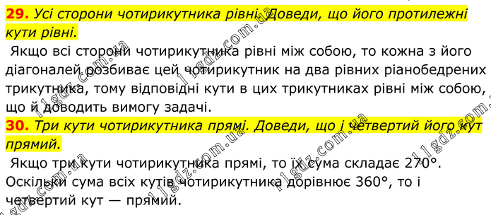 29. Усі сторони чотирикутника рівні. Доведи, що його протилежні кути рівні. Якщо всі сторони чотирикутника рівні між собою, то кожна з його діагоналей розбиває цей чотирикутник на два рівних ріанобедрених трикутника, тому відповідні кути в цих трикутниках рівні між собою, що й доводить вимогу задачі. 30. Три кути чотирикутника прямі. Доведи, що і четвертий його кут прямий. Якщо три кути чотирикутника прямі, то їх сума складає 270°. Оскільки сума всіх кутів чотирикутника дорівнює 360°, то і четвертий кут — прямий.