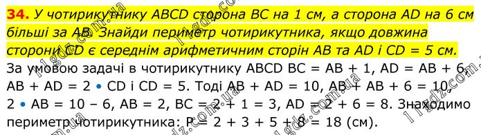 34. У чотирикутнику ABCD сторона BC на 1 см, а сторона AD на 6 см більші за AB. Знайди периметр чотирикутника, якщо довжина сторони CD є середнім арифметичним сторін AB та AD і CD = 5 см. За умовою задачі в чотирикутнику ABCD BC = AB + 1, AD = AB + 6, AB + AD = 2 • CD і CD = 5. Тоді АВ + AD = 10, AВ + AB + 6 = 10, 2 • AВ = 10 – 6, AB = 2, BC = 2 + 1 = 3, AD = 2 + 6 = 8. Знаходимо периметр чотирикутника: P = 2 + 3 + 5 + 8 = 18 (см).