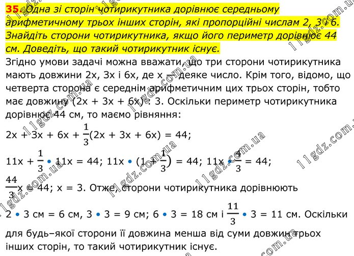 35. Одна зі сторін чотирикутника дорівнює середньому арифметичному трьох інших сторін, які пропорційні числам 2, 3 і 6. Знайдіть сторони чотирикутника, якщо його периметр дорівнює 44 см. Доведіть, що такий чотирикутник існує. Згідно умови задачі можна вважати, що три сторони чотирикутника мають довжини 2х, Зх і 6х, де х — деяке число. Крім того, відомо, що четверта сторона є середнім арифметичним цих трьох сторін, тобто має довжину (2х + 3х + 6х) : 3. Оскільки периметр чотирикутника дорівнює 44 см, то маємо рівняння: 2х + Зх + 6х + 1/3(2х + 3х + 6х) = 44; 11х + 1/3 • 11х = 44; 11x • (1 + 1/3) = 44; 11х • 4/3 = 44; 44/3х = 44; х = 3. Отже, сторони чотирикутника дорівнюють 2 • 3 см = 6 см, 3 • 3 = 9 см; 6 • 3 = 18 см і 11/3 • 3 = 11 см. Оскільки для будь–якої сторони її довжина менша від суми довжин трьох інших сторін, то такий чотирикутник існує.
