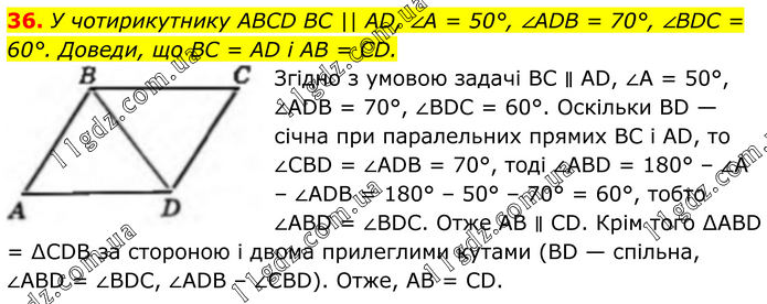 36. У чотирикутнику ABCD BC || AD, ∠A = 50°, ∠ADB = 70°, ∠BDC = 60°. Доведи, що BC = AD і AB = CD. Згідно з умовою задачі BC ∥ AD, ∠A = 50°, ∠ADB = 70°, ∠ВDC = 60°. Оскільки BD — січна при паралельних прямих BC і AD, то ∠CBD = ∠ADB = 70°, тоді ∠ABD = 180° – ∠A – ∠ADB = 180° – 50° – 70° = 60°, тобто ∠ABD = ∠BDC. Отже AB ∥ CD. Крім того ∆ABD = ∆CDB за стороною і двома прилеглими кутами (BD — спільна, ∠ABD = ∠BDC, ∠ADB – ∠CBD). Отже, AB = CD.