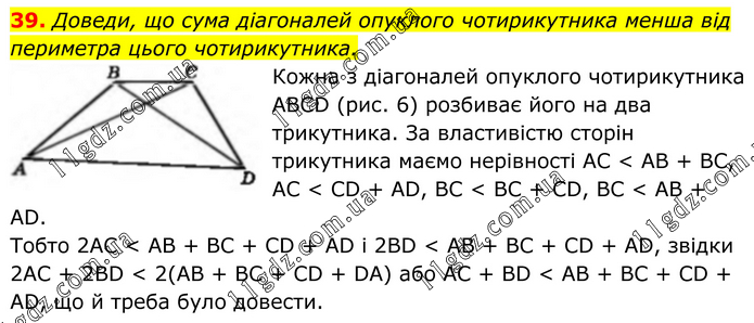 39. Доведи, що сума діагоналей опуклого чотирикутника менша від периметра цього чотирикутника. Кожна з діагоналей опуклого чотирикутника ABCD (рис. 6) розбиває його на два трикутника. За властивістю сторін трикутника маємо нерівності AC < AB + BC, AC < CD + AD, BC < BC + CD, BC < AB + AD. Тобто 2АС < АВ + BC + CD + AD і 2BD < AB + BC + CD + AD, звідки 2АС + 2BD < 2(АВ + BC + CD + DA) або AC + BD < AB + BC + CD + AD, що й треба було довести.