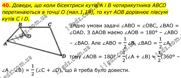 40. Доведи, що коли бісектриси кутів A і B чотирикутника ABCD перетинаються в точці O (мал.1.14), то кут AOB дорівнює півсумі кутів C і D. Згідно умови задачі ∠ABO = ∠OBC, ∠BAO = ∠OAD. З ∆AOB маємо ∠AOB = 180° – ∠ABO – ∠BAO. Але ∠ABO = 1/2∠B, ∠BAO = 1/2∠A, тому ∠AOB = 180° – 1/2(∠A + ∠B) = 1/2(360° – ∠A – ∠B) = 1/2 (∠C + ∠D), що й треба було довести.