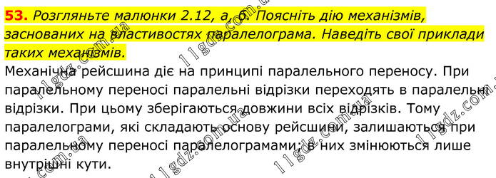 53. Розгляньте малюнки 2.12, а, б. Поясніть дію механізмів, заснованих на властивостях паралелограма. Наведіть свої приклади таких механізмів. Механічна рейсшина діє на принципі паралельного переносу. При паралельному переносі паралельні відрізки переходять в паралельні відрізки. При цьому зберігаються довжини всіх відрізків. Тому паралелограми, які складають основу рейсшини, залишаються при паралельному переносі паралелограмами; в них змінюються лише внутрішні кути.