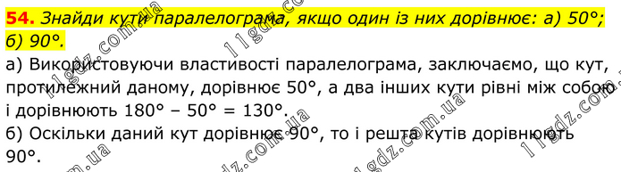 54. Знайди кути паралелограма, якщо один із них дорівнює: а) 50°; б) 90°. а) Використовуючи властивості паралелограма, заключаємо, що кут, протилежний даному, дорівнює 50°, а два інших кути рівні між собою і дорівнюють 180° – 50° = 130°. б) Оскільки даний кут дорівнює 90°, то і решта кутів дорівнюють 90°.