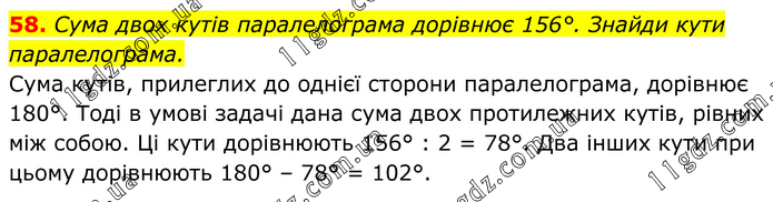 58. Сума двох кутів паралелограма дорівнює 156°. Знайди кути паралелограма. Сума кутів, прилеглих до однієї сторони паралелограма, дорівнює 180°. Тоді в умові задачі дана сума двох протилежних кутів, рівних між собою. Ці кути дорівнюють 156° : 2 = 78°. Два інших кути при цьому дорівнюють 180° – 78° = 102°.