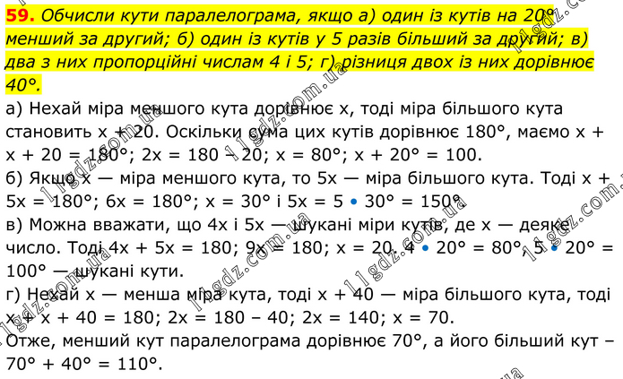 59. Обчисли кути паралелограма, якщо а) один із кутів на 20° менший за другий; б) один із кутів у 5 разів більший за другий; в) два з них пропорційні числам 4 і 5; г) різниця двох із них дорівнює 40°. а) Нехай міра меншого кута дорівнює х, тоді міра більшого кута становить х + 20. Оскільки сума цих кутів дорівнює 180°, маємо х + х + 20 = 180°; 2х = 180 – 20; х = 80°; х + 20° = 100. б) Якщо х — міра меншого кута, то 5х — міра більшого кута. Тоді х + 5х = 180°; 6х = 180°; х = 30° і 5х = 5 • 30° = 150°. в) Можна вважати, що 4х і 5х — шукані міри кутів, де х — деяке число. Тоді 4х + 5х = 180; 9х = 180; х = 20. 4 • 20° = 80°, 5 • 20° = 100° — шукані кути. г) Нехай х — менша міра кута, тоді х + 40 — міра більшого кута, тоді х + х + 40 = 180; 2х = 180 – 40; 2х = 140; х = 70. Отже, менший кут паралелограма дорівнює 70°, а його більший кут – 70° + 40° = 110°.