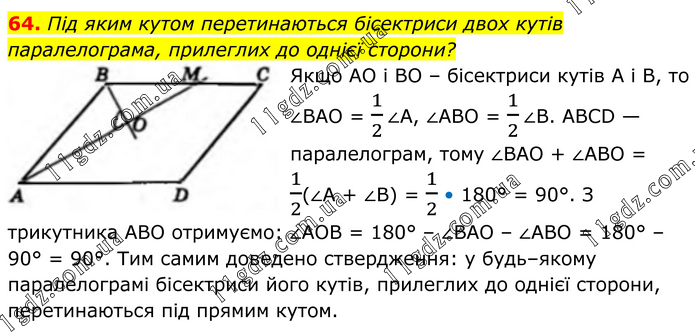 64. Під яким кутом перетинаються бісектриси двох кутів паралелограма, прилеглих до однієї сторони? Якщо AO і BO – бісектриси кутів А і В, то ∠BAO = 1/2∠A, ∠ABO = 1/2∠B. ABCD — паралелограм, тому ∠BAO + ∠ABO = 1/2(∠A + ∠B) = 1/2 • 180° = 90°. З трикутника ABO отримуємо: ∠AOB = 180° – ∠BAO – ∠ABO = 180° – 90° = 90°. Тим самим доведено ствердження: у будь–якому паралелограмі бісектриси його кутів, прилеглих до однієї сторони, перетинаються під прямим кутом.