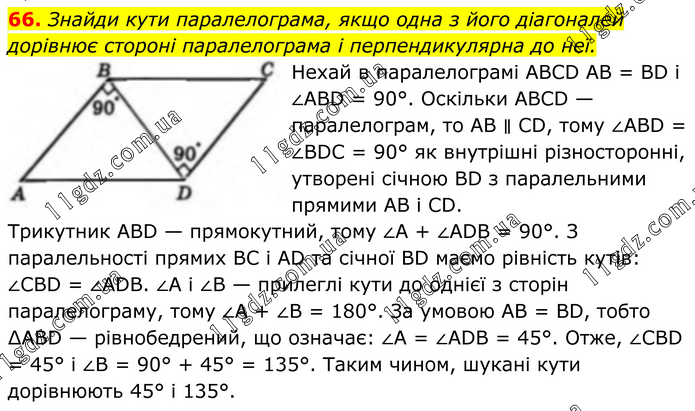 66. Знайди кути паралелограма, якщо одна з його діагоналей дорівнює стороні паралелограма і перпендикулярна до неї. Нехай в паралелограмі ABCD AB = BD і ∠ABD = 90°. Оскільки ABCD — паралелограм, то AB ∥ CD, тому ∠ABD = ∠BDC = 90° як внутрішні різносторонні, утворені січною BD з паралельними прямими AB і CD. Трикутник ABD — прямокутний, тому ∠A + ∠ADB = 90°. З паралельності прямих BC і AD та січної BD маємо рівність кутів: ∠CBD = ∠ADB. ∠A і ∠B — прилеглі кути до однієї з сторін паралелограму, тому ∠A + ∠B = 180°. За умовою AB = BD, тобто ∆ABD — рівнобедрений, що означає: ∠A = ∠ADB = 45°. Отже, ∠CBD = 45° і ∠B = 90° + 45° = 135°. Таким чином, шукані кути дорівнюють 45° і 135°.