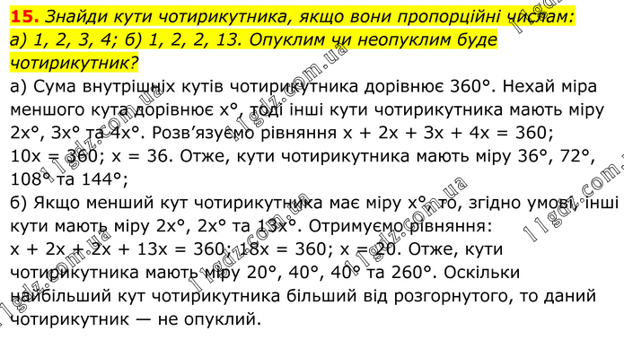 15. Знайди кути чотирикутника, якщо вони пропорційні числам: а) 1, 2, 3, 4; б) 1, 2, 2, 13. Опуклим чи неопуклим буде чотирикутник? а) Сума внутрішніх кутів чотирикутника дорівнює 360°. Нехай міра меншого кута дорівнює х°, тоді інші кути чотирикутника мають міру 2х°, Зх° та 4х°. Розв’язуємо рівняння х + 2х + Зх + 4х = 360; 10x = 360; х = 36. Отже, кути чотирикутника мають міру 36°, 72°, 108° та 144°; б) Якщо менший кут чотирикутника має міру х°, то, згідно умові, інші кути мають міру 2х°, 2х° та 13х°. Отримуємо рівняння: х + 2х + 2х + 13х = 360; 18х = 360; х = 20. Отже, кути чотирикутника мають міру 20°, 40°, 40° та 260°. Оскільки найбільший кут чотирикутника більший від розгорнутого, то даний чотирикутник — не опуклий.