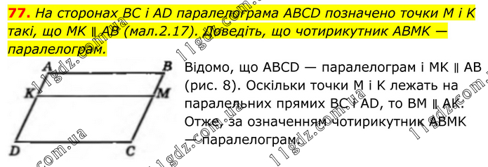 77. На сторонах BC і AD паралелограма ABCD позначено точки M і K такі, що MK ∥ AB (мал.2.17). Доведіть, що чотирикутник ABMK — паралелограм. Відомо, що ABCD — паралелограм і MK ∥ AB (рис. 8). Оскільки точки M і K лежать на паралельних прямих BC і AD, то BМ ∥ AK. Отже, за означенням чотирикутник ABMK — паралелограм.