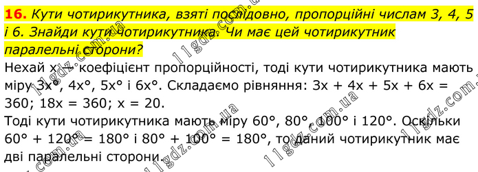 16. Кути чотирикутника, взяті послідовно, пропорційні числам 3, 4, 5 і 6. Знайди кути чотирикутника. Чи має цей чотирикутник паралельні сторони? Нехай х — коефіцієнт пропорційності, тоді кути чотирикутника мають міру Зх°, 4х°, 5х° і 6х°. Складаємо рівняння: Зх + 4х + 5х + 6х = 360; 18х = 360; х = 20. Тоді кути чотирикутника мають міру 60°, 80°, 100° і 120°. Оскільки 60° + 120° = 180° і 80° + 100° = 180°, то даний чотирикутник має дві паралельні сторони.