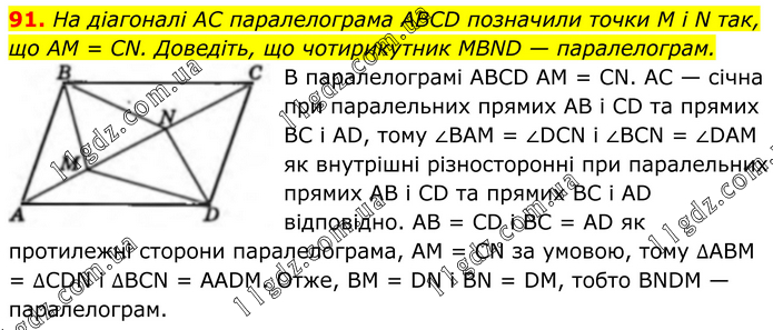 91. На діагоналі AC паралелограма ABCD позначили точки M і N так, що AM = CN. Доведіть, що чотирикутник MBND — паралелограм. В паралелограмі ABCD AM = CN. AC — січна при паралельних прямих AВ і CD та прямих BC і AD, тому ∠BAM = ∠DCN і ∠BCN = ∠DAM як внутрішні різносторонні при паралельних прямих AB і CD та прямих BC і AD відповідно. AB = CD і BC = AD як протилежні сторони паралелограма, AM = CN за умовою, тому ∆ABM = ∆CDN і ∆BCN = AADM. Отже, BM = DN і BN = DM, тобто BNDM — паралелограм.