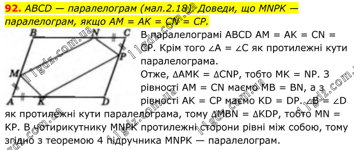 92. ABCD — паралелограм (мал.2.18). Доведи, що MNPK — паралелограм, якщо AM = AK = CN = CP. В паралелограмі ABCD AM = AK = CN = CP. Крім того ∠A = ∠C як протилежні кути паралелограма. Отже, ∆AMK = ∆CNP, тобто MK = NP. З рівності AM = CN маємо MB = BN, а з рівності AK = CP маємо KD = DP. ∠B = ∠D як протилежні кути паралелограма, тому ∆MBN = ∆KDP, тобто MN = KP. В чотирикутнику MNPK протилежні сторони рівні між собою, тому згідно з теоремою 4 підручника MNPK — паралелограм.