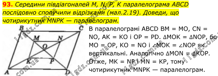 93. Середини півдіагоналей M, N, P, K паралелограма ABCD послідовно сполучили відрізками (мал.2.19). Доведи, що чотирикутник MNPK — паралелограм. В паралелограмі ABCD BM = MO, CN = NO, AK = KO i OP = PD. ∆MOK = ∆NOP, бо МO = OP, KO = NO і ∠MOK = ∠NOP як вертикальні. Аналогічно ∆MON = ∆КОР. Отже, MK = NP i MN = KP, тому чотирикутник MNPK — паралелограм.