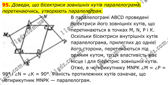 95. Доведи, що бісектриси зовнішніх кутів паралелограма, перетинаючись, утворюють паралелограм. В паралелограмі ABCD проведені бісектриси його зовнішніх кутів, що перетинаються в точках М, N, P і К. Оскільки бісектриси внутрішніх кутів паралелограма, прилеглих до однієї його сторони, перетинаються під прямим кутом, то ця властивість має місце і для бісектрис зовнішніх кутів. Отже, в чотирикутнику MNPK ∠M = ∠P = 90° і ∠N = ∠K = 90°. Рівність протилежних кутів означає, що чотирикутник MNPK — паралелограм.