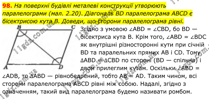 98. На поверхні будівлі металеві конструкції утворюють паралелограми (мал. 2.20). Діагональ BD паралелограма ABCD є бісектрисою кута B. Доведи, що сторони паралелограма рівні. Згідно з умовою ∠ABD = ∠CBD, бо BD — бісектриса кута В. Крім того, ∠ABD = ∠BDC як внутрішні різносторонні кути при січній BD та паралельних прямих AB і CD. Тому ∆ABD = ∆CBD по стороні (BD — спільна) і двом прилеглим кутам. Оскільки ∠ABD = ∠ADB, то ∆ABD — рівнобедрений, тобто AB = AD. Таким чином, всі сторони паралелограма ABCD рівні між собою. Надалі, згідно з означенням, такий вид паралелограма будемо називати ромбом.
