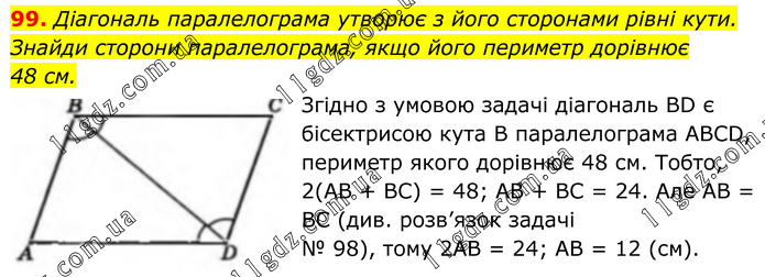 99. Діагональ паралелограма утворює з його сторонами рівні кути. Знайди сторони паралелограма, якщо його периметр дорівнює 48 см. Згідно з умовою задачі діагональ BD є бісектрисою кута В паралелограма ABCD, периметр якого дорівнює 48 см. Тобто, 2(АВ + BC) = 48; AB + BC = 24. Але AB = BC (див. розв’язок задачі № 98), тому 2АВ = 24; AB = 12 (см).