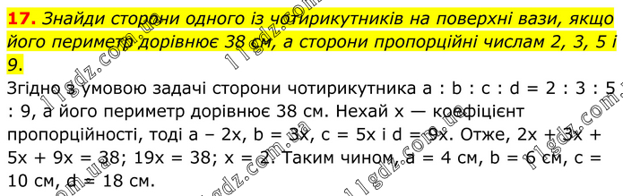 17. Знайди сторони одного із чотирикутників на поверхні вази, якщо його периметр дорівнює 38 см, а сторони пропорційні числам 2, 3, 5 і 9. Згідно з умовою задачі сторони чотирикутника а : b : с : d = 2 : 3 : 5 : 9, а його периметр дорівнює 38 см. Нехай х — коефіцієнт пропорційності, тоді а – 2х, b = Зх, с = 5х і d = 9х. Отже, 2х + Зх + 5х + 9х = 38; 19х = 38; х = 2. Таким чином, а = 4 см, b = 6 см, с = 10 см, d = 18 см.