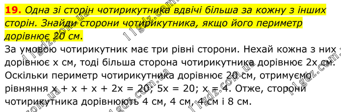 19. Одна зі сторін чотирикутника вдвічі більша за кожну з інших сторін. Знайди сторони чотирикутника, якщо його периметр дорівнює 20 см. За умовою чотирикутник має три рівні сторони. Нехай кожна з них дорівнює х см, тоді більша сторона чотирикутника дорівнює 2х см. Оскільки периметр чотирикутника дорівнює 20 см, отримуємо рівняння х + х + х + 2х = 20; 5х = 20; х = 4. Отже, сторони чотирикутника дорівнюють 4 см, 4 см, 4 см і 8 см.