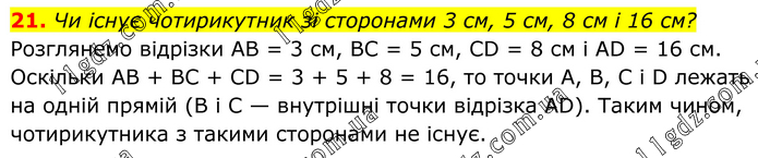 21. Чи існує чотирикутник зі сторонами 3 см, 5 см, 8 см і 16 см? Розглянемо відрізки AВ = 3 см, ВC = 5 см, CD = 8 см і AD = 16 см. Оскільки AВ + BC + CD = 3 + 5 + 8 = 16, то точки А, В, C і D лежать на одній прямій (В і C — внутрішні точки відрізка AD). Таким чином, чотирикутника з такими сторонами не існує.