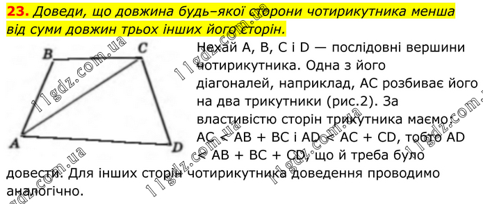 23. Доведи, що довжина будь–якої сторони чотирикутника менша від суми довжин трьох інших його сторін. Нехай А, В, C і D — послідовні вершини чотирикутника. Одна з його діагоналей, наприклад, AC розбиває його на два трикутники (рис.2). За властивістю сторін трикутника маємо: AC < AВ + ВC і AD < AC + CD, тобто AD < AВ + BC + CD, що й треба було довести. Для інших сторін чотирикутника доведення проводимо аналогічно.